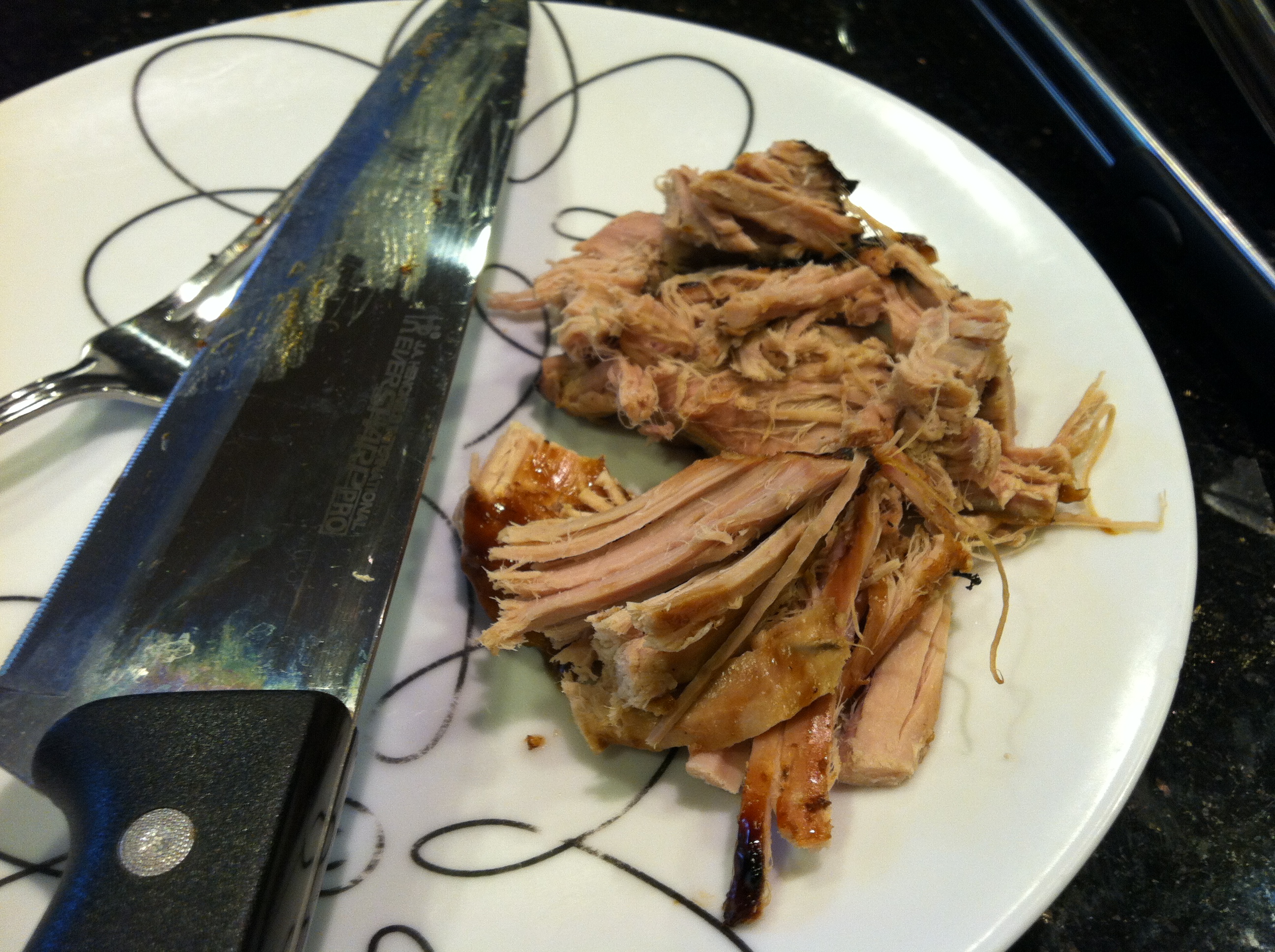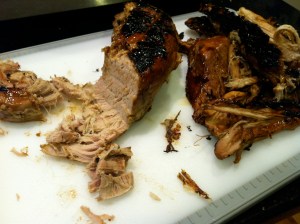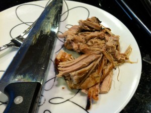 My only problem was that the meat came out so stringy that it wasn’t easy to slice at all. We ended up putting what amounted at that point to pulled pork into buns and eating sandwiches instead of the nice sophisticated presentation I had planned in my head. Also, after the 8 hours in the crock pot plus time in the pan, the meat was a little dry.
