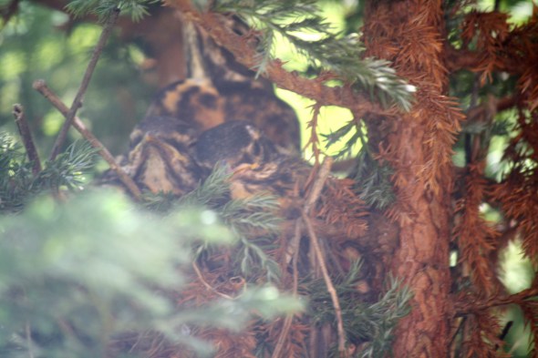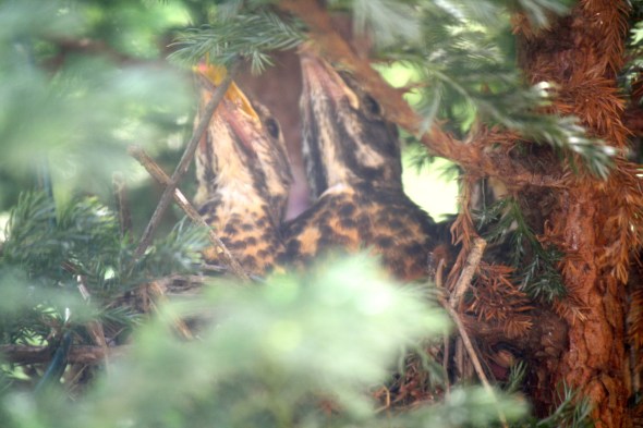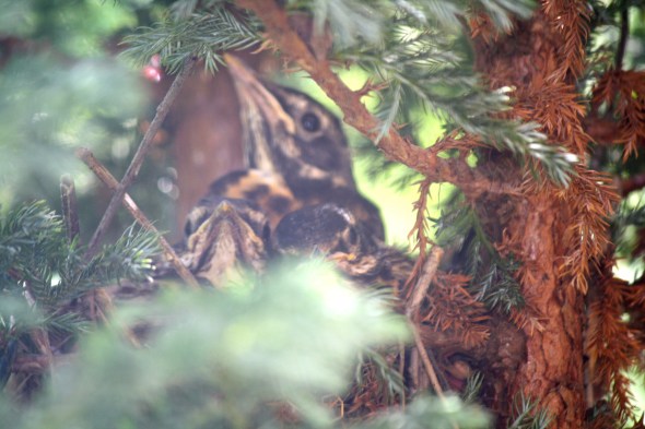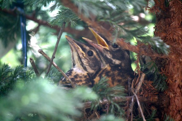 Posted: June 8, 2012 Filed under: Day-to-Day, Environment, family, garden | Tags: birds, robins 1 CommentA family of robins has made a home right outside our dining room in an arborvitae tree. Today while I was taking photos, the father came and fed the chicks. There are four total, but you can only see three from this angle.