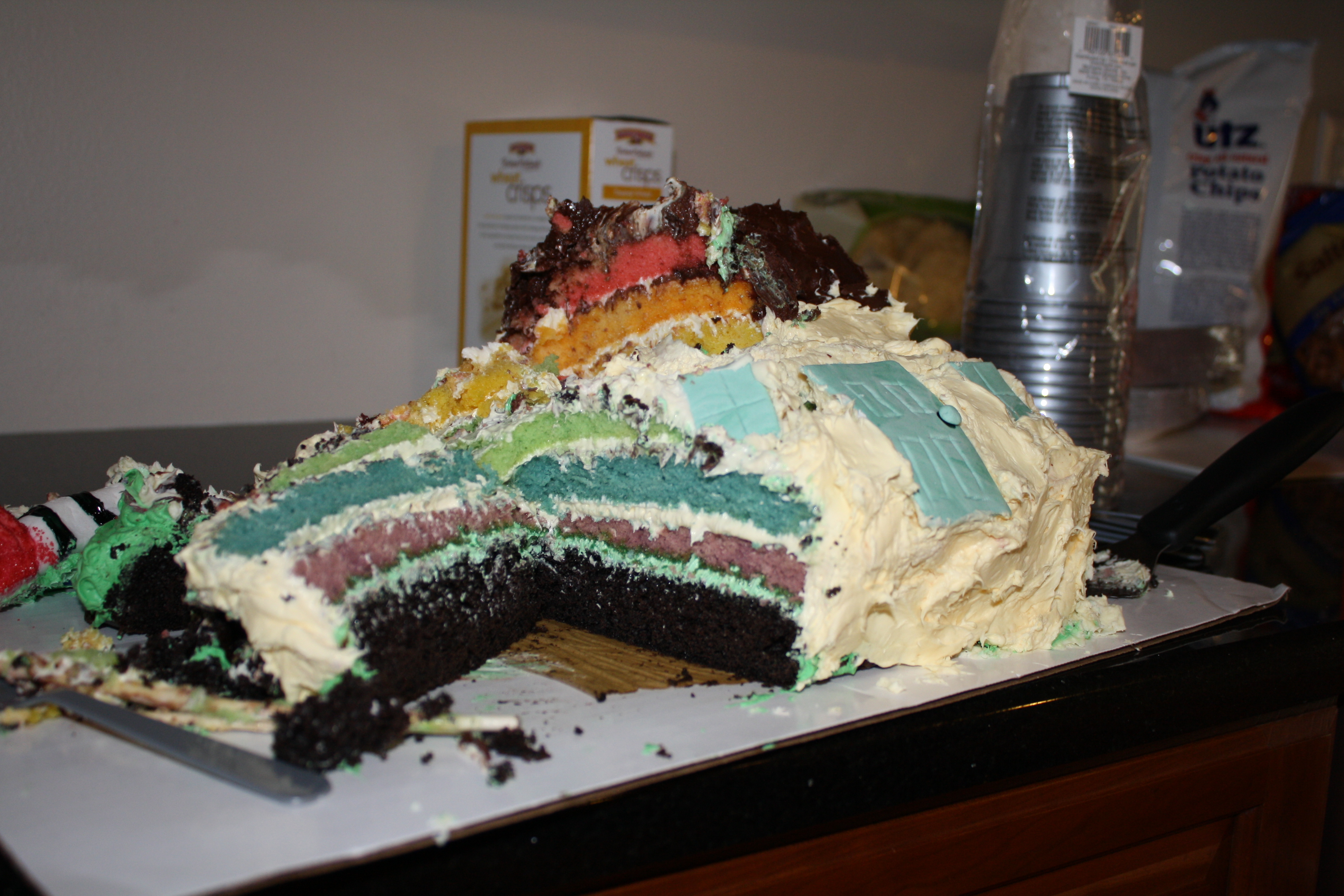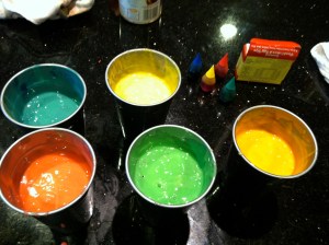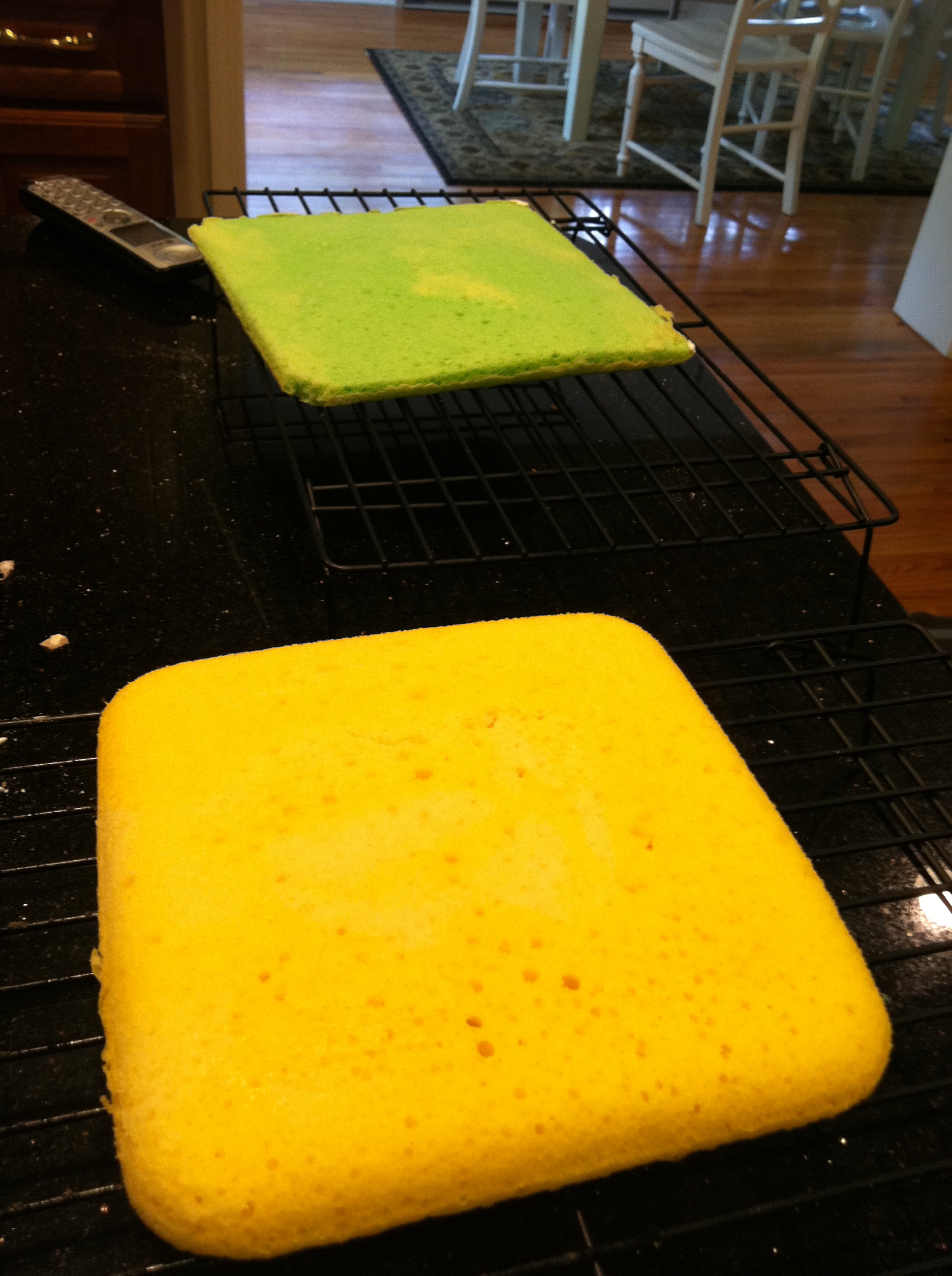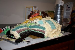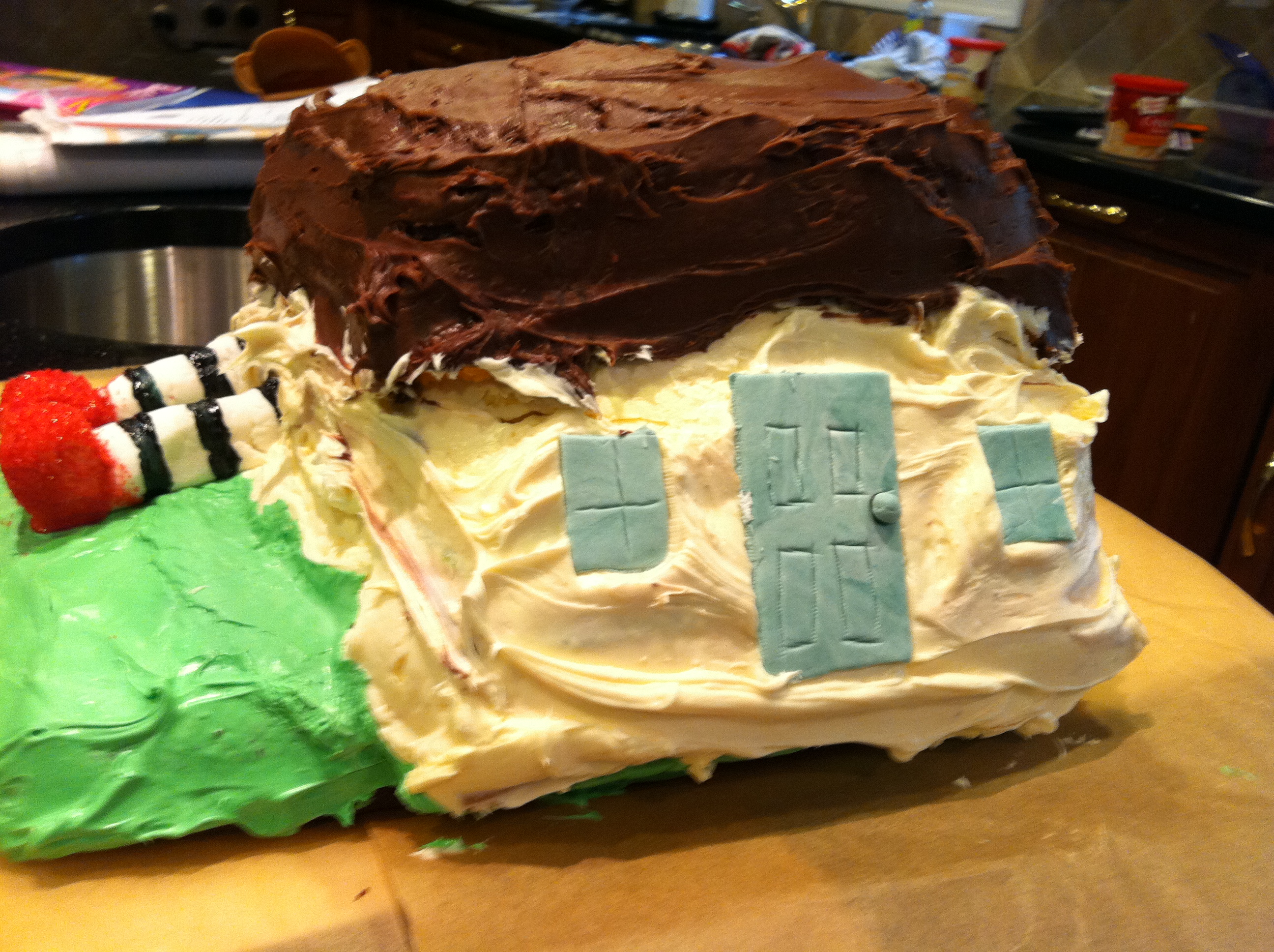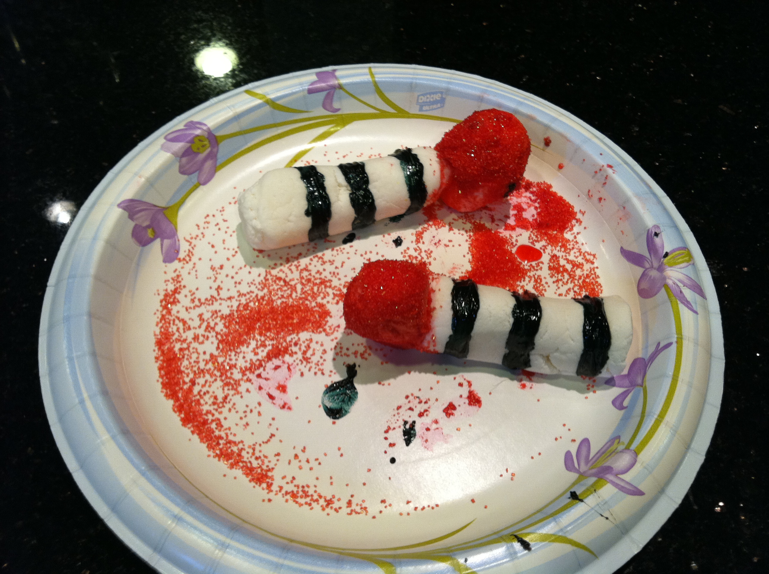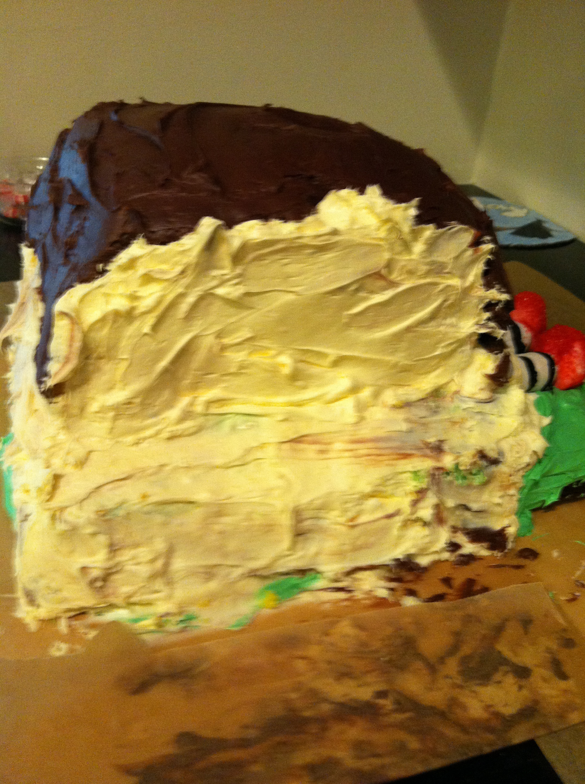 Then, after all that — the cupcakes…well, let’s just say that the Cupcake Caddy — not so good. It looked like the cupcakes had thrown their own party on the way to school, and a fight must have broken out or something. By the time we got there, (and mind you, it’s not a far trip; there are no hills or potholes along the way) most of them had put their petite icing heads together. I had to smooth over all my fancy work with a plastic knife Clooney’s teacher had on hand.