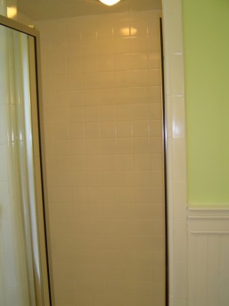 But he’s nice, and I trust him. He works a lot for my dad, who specializes in historic reconstruction. My house is old, built in the late 19th Century. Before we moved in, it was last renovated in the Seventies, hence the Carol-Brady olive. The door to the shower is small, with two 8-inch walls on either side of it. The walls are also decorated with beadboard on the bottom half.